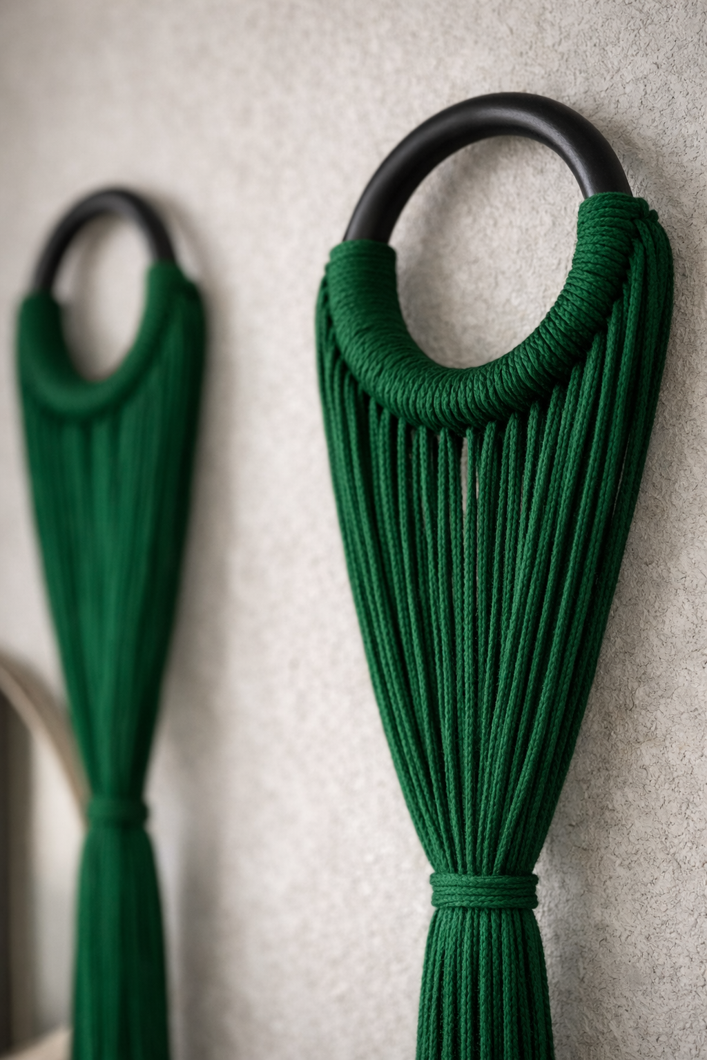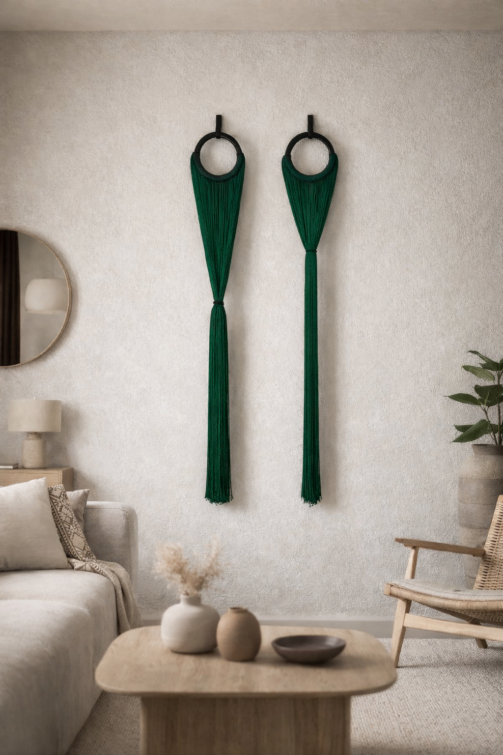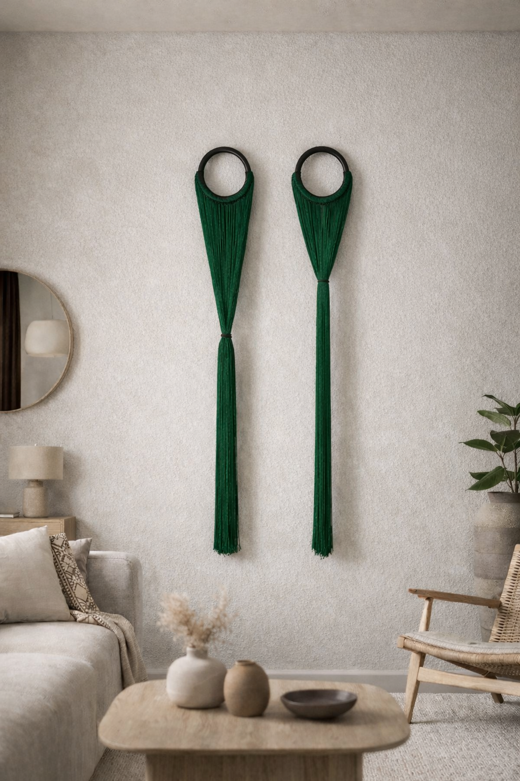 Art Sanat 2’li Duvar Dekoru – Yeşil, mekâna doğal bir sakinlik ve dengeli bir ritim kazandıran modern bir duvar aksesuarıdır. Derin yeşil tonlu, ince örgülü ve ipeksi dokulu ipler sayesinde mekânda yumuşak ama güçlü bir görsel etki oluşturur.
