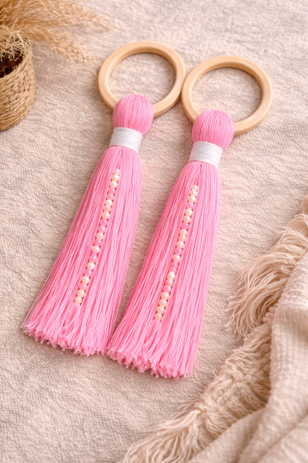 Doğal ip dokusu ve yumuşak pembe tonuyla mekâna sade bir boho denge katar.