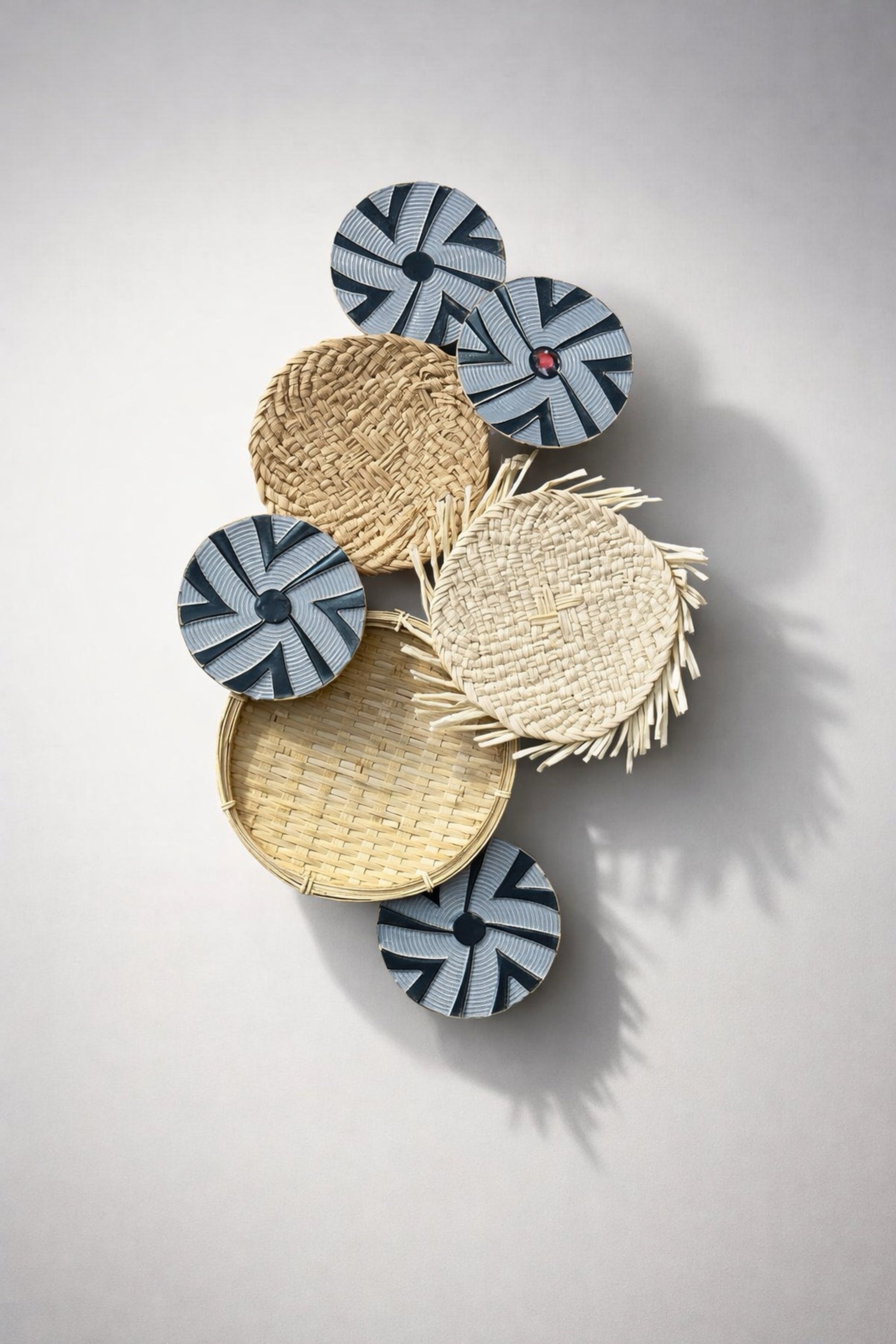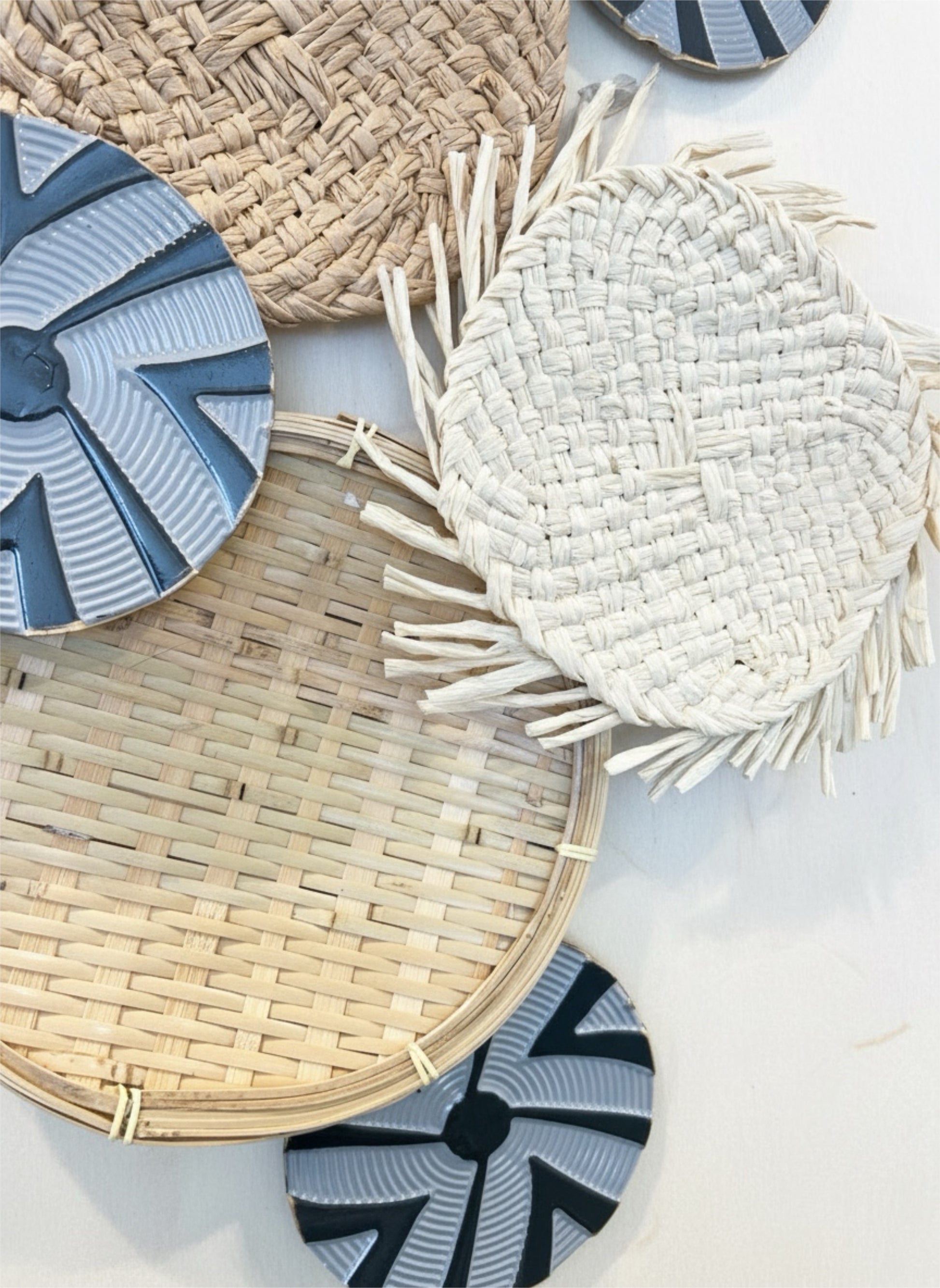 Doğal hasır dokular ve geometrik mavi detayların birleştiği özgün bir duvar kompozisyonu. El yapımı hissi ve doğal malzemeleri sayesinde mekâna sıcak, boho ve modern bir atmosfer kazandırır.