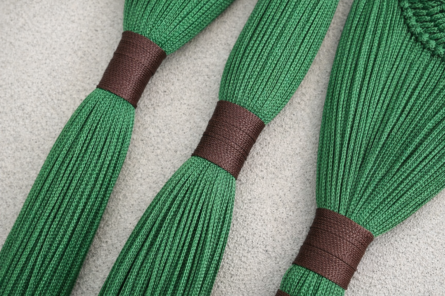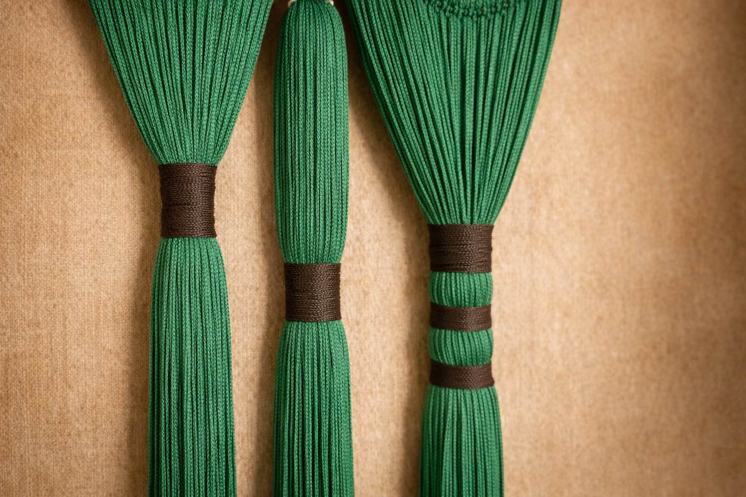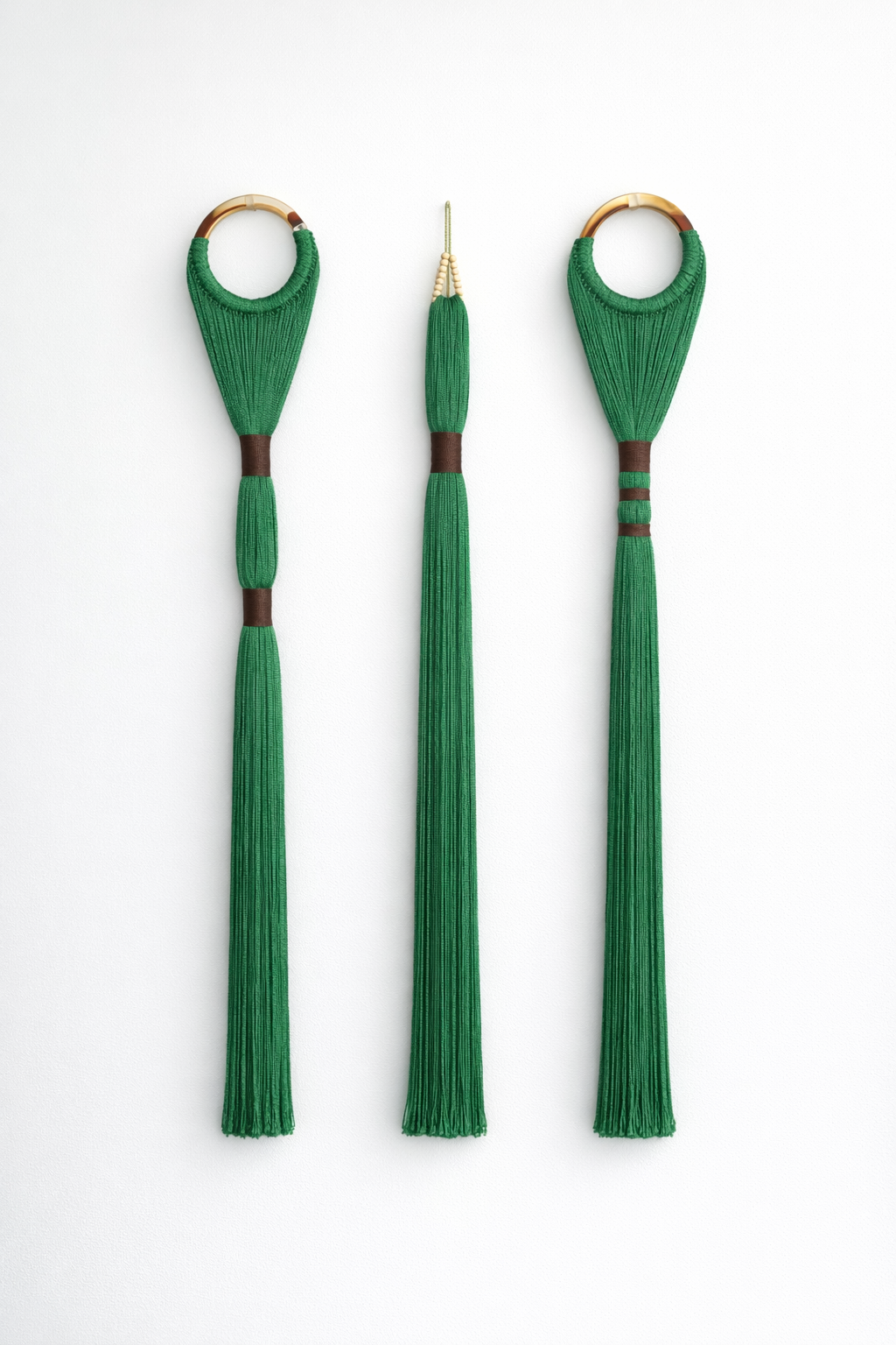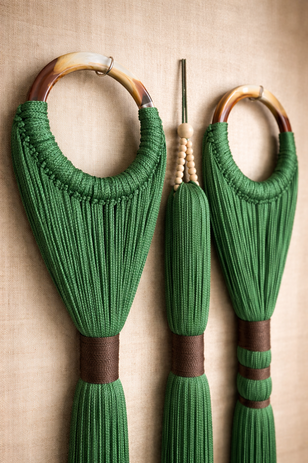 Doğal yeşil tonlu iplerin dikey akışıyla mekâna sakinlik ve dengeli bir boho ritmi kazandırır.